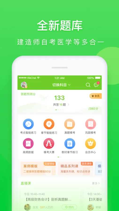 万题库,专注于建造师、自考、医学、会计等热门考试,为考生提供优质、个性化的在线培训服务。这是一款集刷题、听课、直播、资讯、答疑……为一体的移动学习平台。