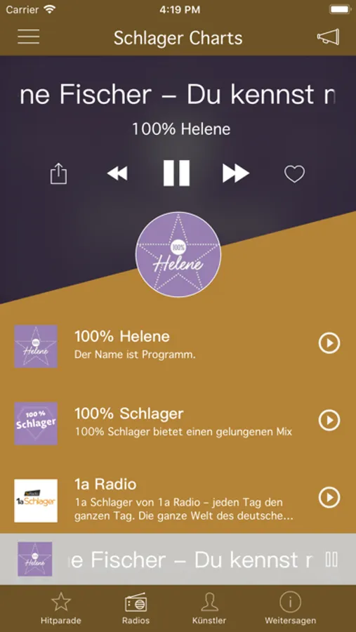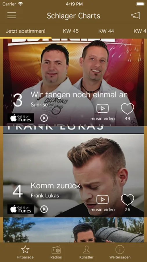 Die Hitparade der deutschen Schlager-Musik in einer App vereint. Stimme für deinen Lieblings-Hit und verhilf deinem Star zum Platz Nr. 1 der deutschen Schlager-Charts.