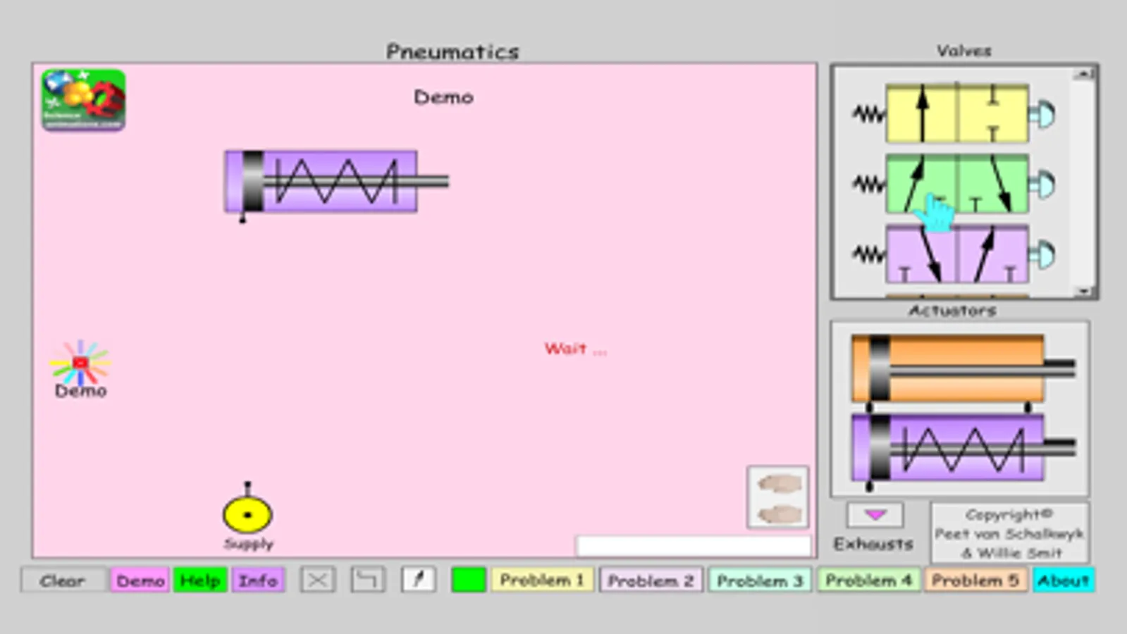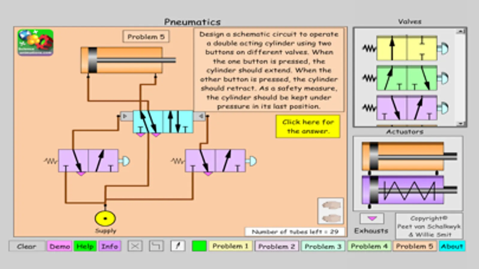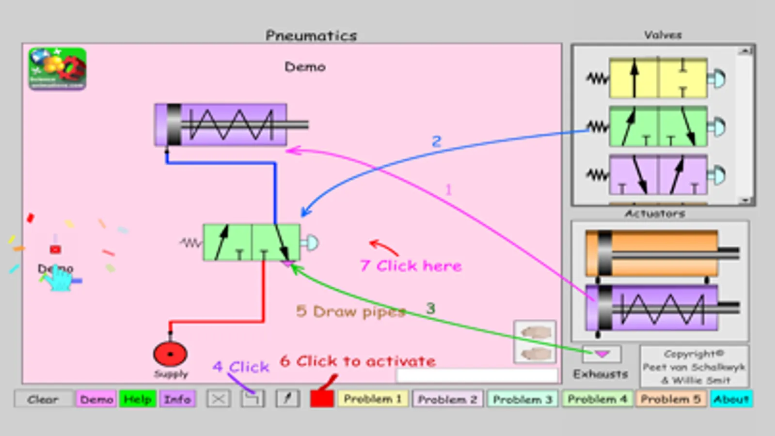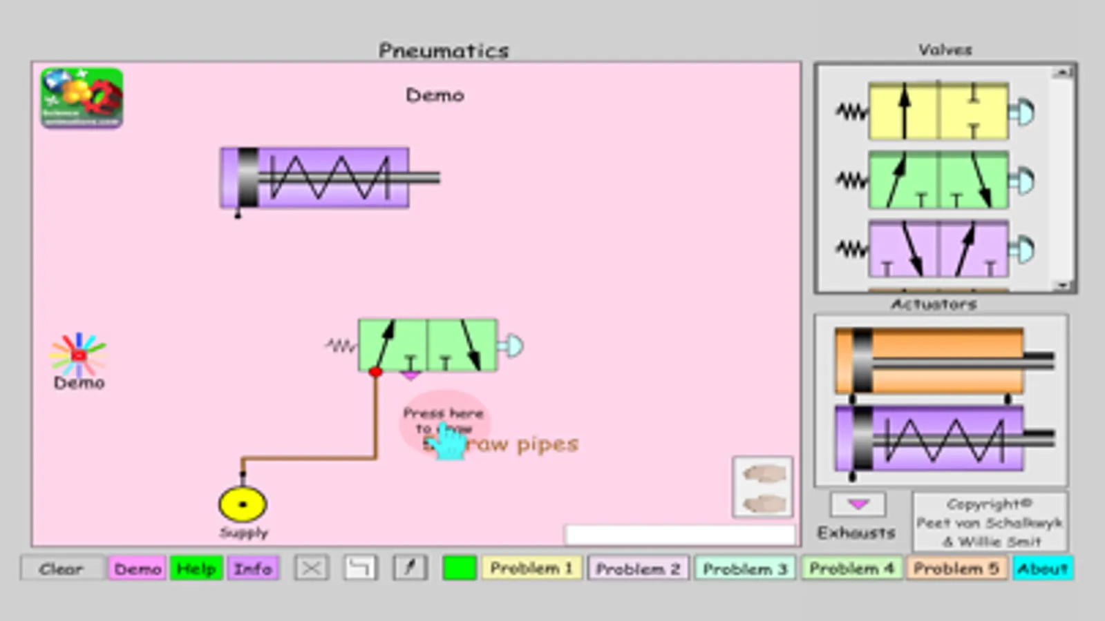 The user drags valves, actuators and exhausts to a design board, draw tubes, activate and then see an animation of how the design works!