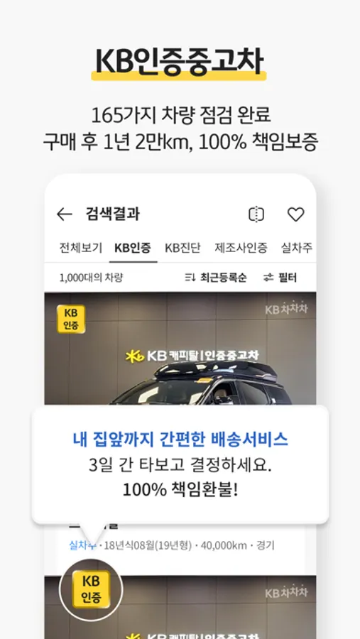 실차주마크로 안심까지 더한 KB차차차에서 스마트한 중고차 거래 생활을 시작하세요.
