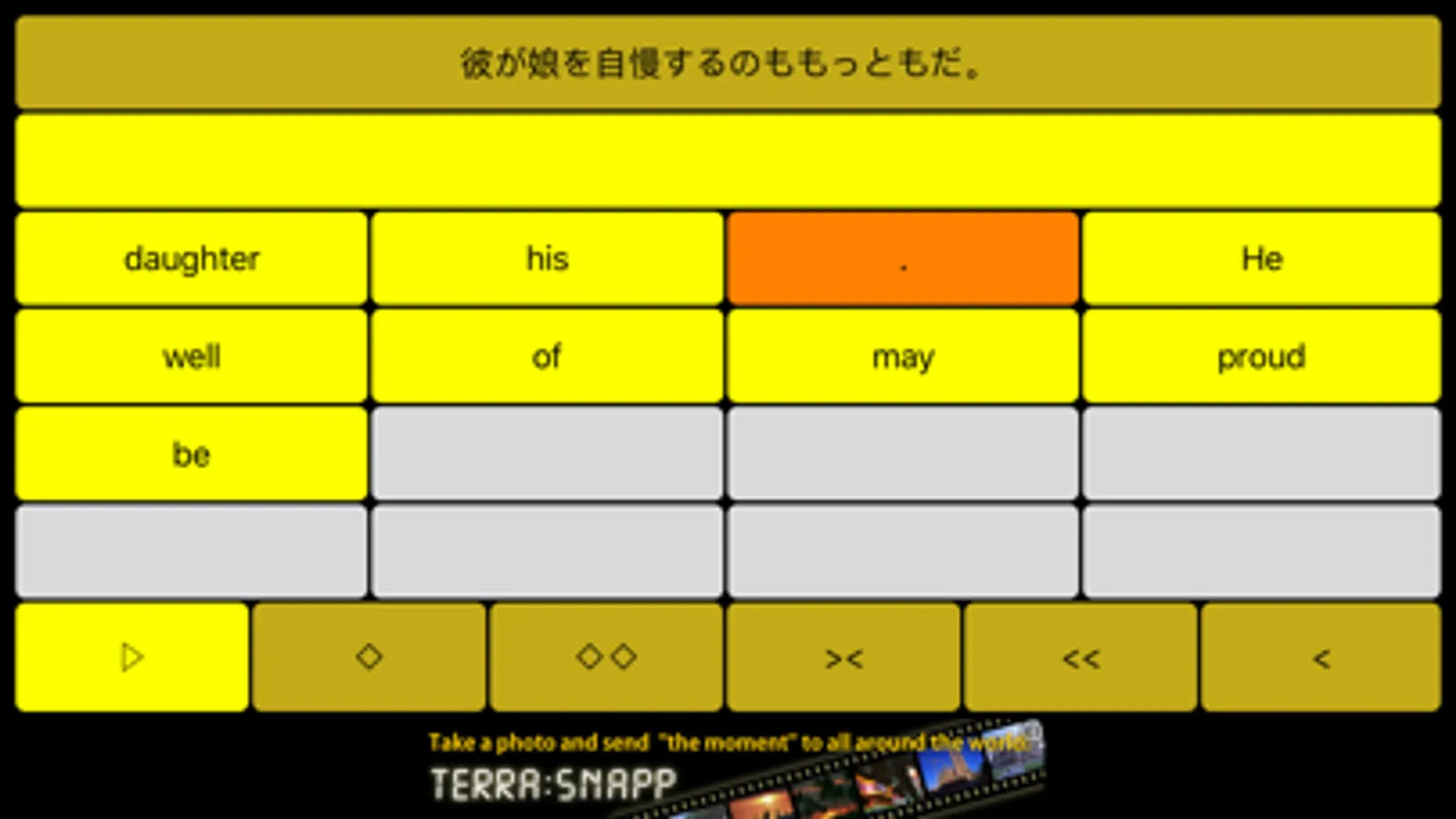 高校英語の基本的な構文を覚えるための練習用アプリです。単語を並べ替えてゲーム感覚で正しい英文をつくることができます。このアプリではitを使う構文や不定詞、助動詞が関係する熟語表現などを扱っています。高校で習うもののうち、比較的易しめの構文を選びました。何度も繰り返しているうちに構文が自然に身についてくるでしょう。覚えるまでとにかく繰り返すことです。マスターすれば、定期試験や受験対策にもなります。