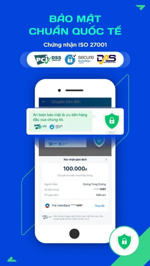 Theo tiêu chuẩn bảo mật toàn cầu PCI DSS và áp dụng công nghệ bảo mật vượt trội như: không lưu thông tin thẻ, bảo mật bằng mật khẩu thanh toán và dấu vân tay,…Được Ngân Hàng Nhà Nước Việt Nam cấp giấy phép và quản lý hoạt động.