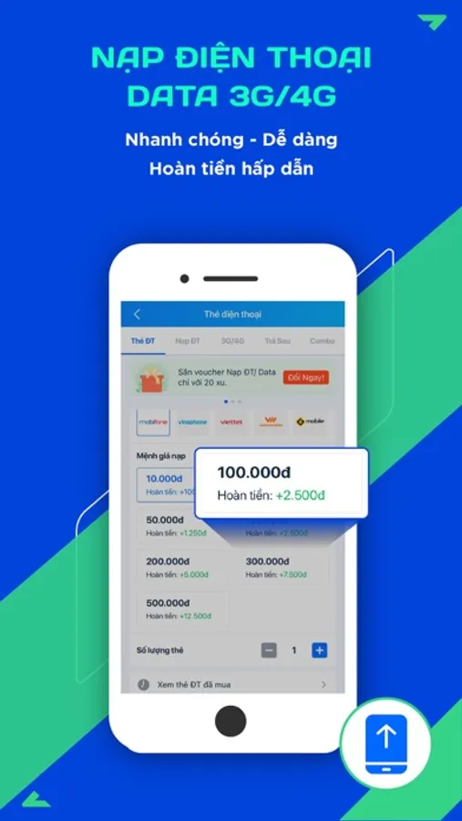 - Nạp tiền và mua thẻ điện thoại Viettel, Mobifone, Vinaphone, Vietnamobile, Gmobile, nhanh chóng, tiện lợi chỉ với vài chạm. Đặc biệt hấp dẫn với chiết khấu cao lên đến 7.5% và các chương trình khuyến mãi, hoàn tiền vào Ngày Vàng.