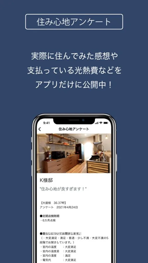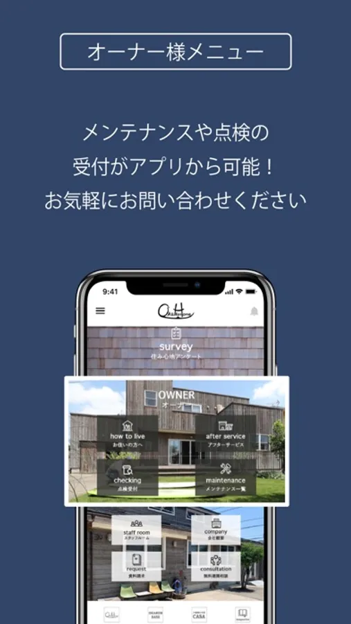 お引渡しの後も、このアプリを通じて点検の受付が可能で、きめ細かいアフターサービスをさせていただきます。