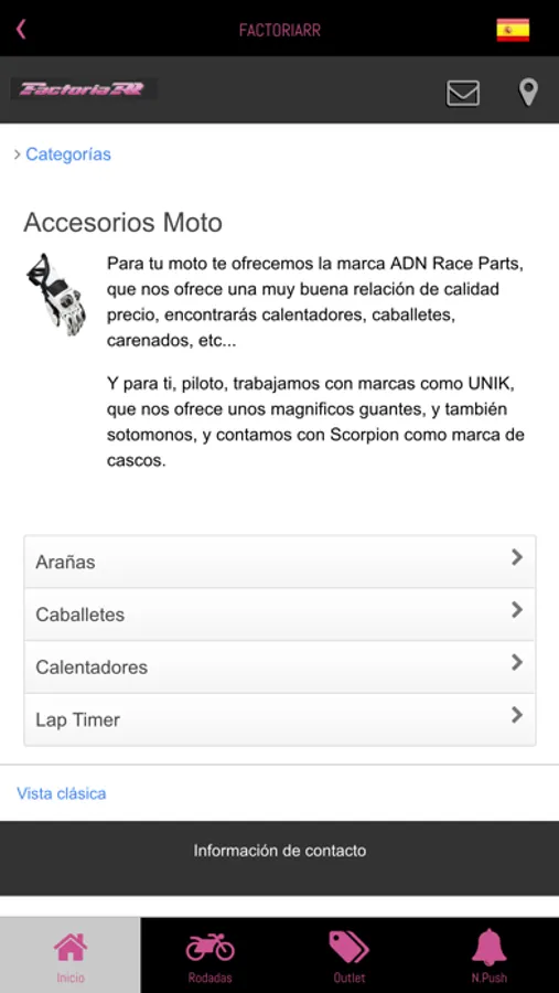 En la app de FactoriaRR podrás encontrar todos los accesorios necesarios tanto para la moto como para el piloto. Echa un vistazo a nuestro outlet. También disponemos de seguros para pilotos y te mantendremos informado de todas las rodadas tanto de Calafat, Parcomotor Castellolí, Cheste, ...
