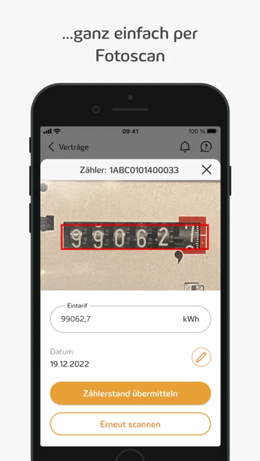 Erfasse Zählerstände mit nur zwei Fingerklicks. Einfach mit der Kamera Deines Smartphones abscannen und übermitteln.