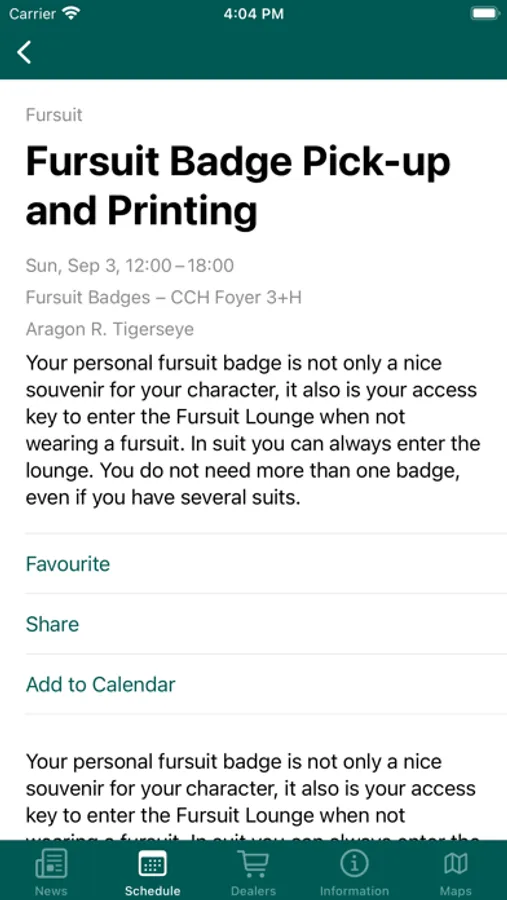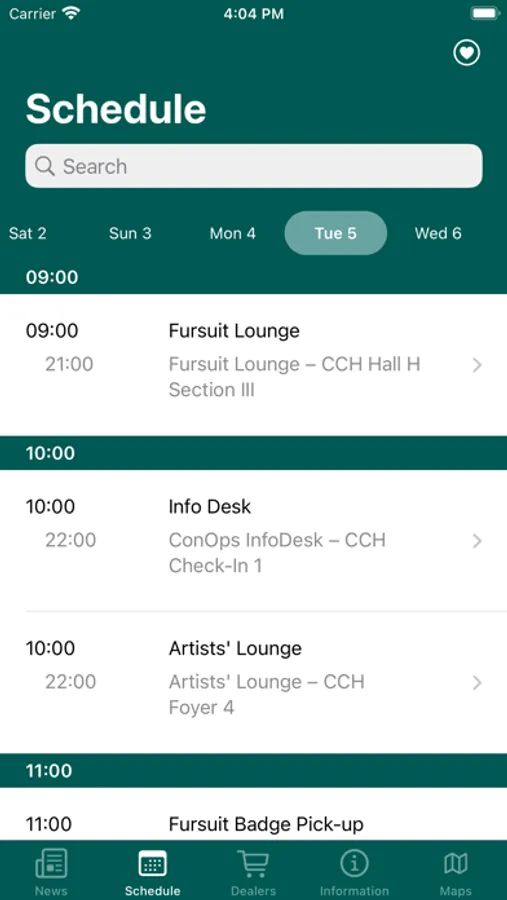 + Tap on the magnifying glass in the Schedule tab to view all favourited events. The app will notify you 15 minutes before an favourite event is starting, giving you time to make your way there.