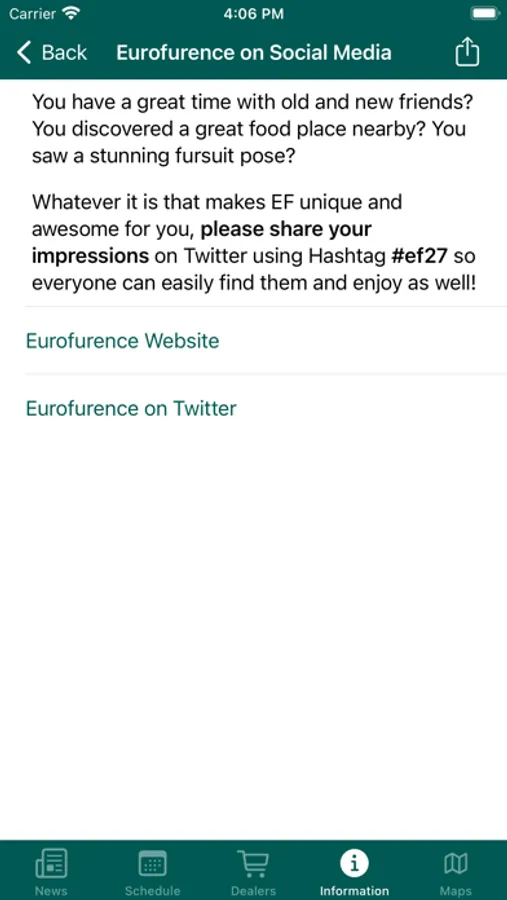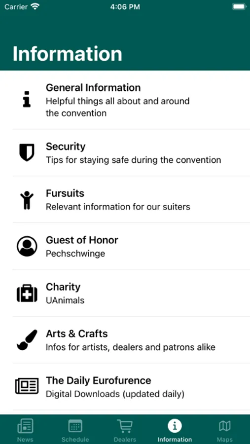- General Information: Know your way around Eurofurence with helpful and interesting information e.g. on travel, parking, charity, our Guests of Honor or the Show Your Badge program.