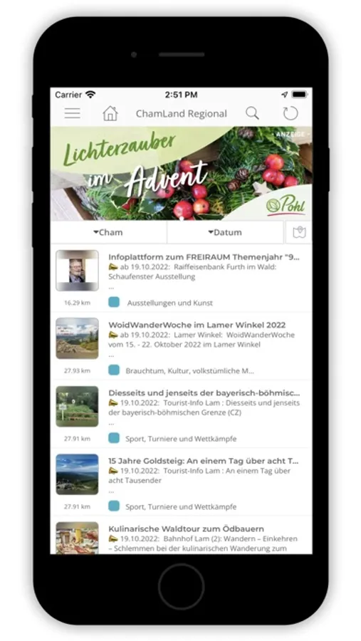 ChamLand Regional ist dein Schaufenster der Region und eine App für den Landkreis Cham! Jetzt kannst du dir auch Einträge aus allen Städten wie Bad Kötzting, Cham, Furth im Wald, Roding, Rötz und Waldmünchen anzeigen lassen!