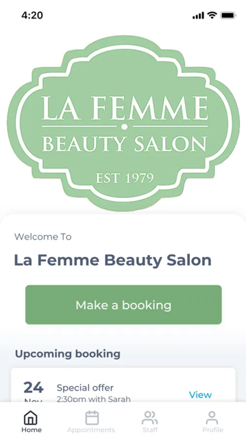 The La Femme Beauty Salon app makes booking your appointments and managing your loyalty points even easier. You're just a few taps away from feeling good and looking great!