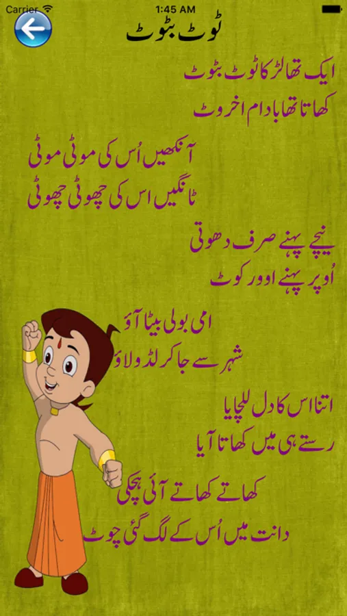 A great fun and an educational tool especially for preschool and kindergarten toddlers. Whether you're a parent of a young child, teacher or an older brother or sister here you will find delightful, charming, uncomplicated, safe, absolutely perfect rhymes for your little ones. All the familiar and best loved nursery rhymes presented in urdu format that can be easily readable and understood for early stage babies. Educational Pakistani poetry for nursery kids in urdu.