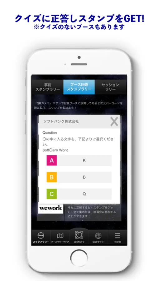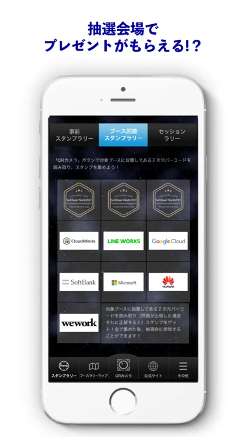 「SoftBank World イベントアプリ」を用いて、スタンプラリーに参加できます。