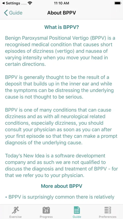 The BPPV Self Help app has been designed to help ensure that users assume the correct positions throughout each stage of each exercise, while also helping track the users progress over the course of the entire exercise programme.