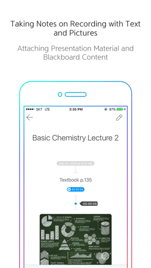 Using high-quality recording and memo functions, camera and image attachment functions, top learning efficiency can be achieved. It also operates safely at long recordings. The files will be safely stored in your smartphone at sudden shut-down. Suitable not only for recordings lecture of students, professors or teachers, but also effective in meetings and seminars.