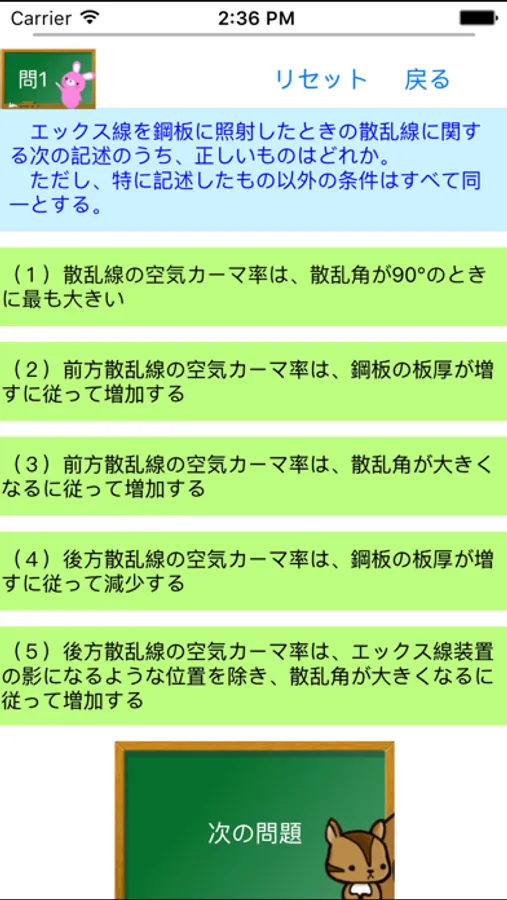 自動で間違えた問題を記憶し、間違えた問題、まだ解いていない問題を優先的に出題します。またセーブ機能がついているため、途中でやめても再度立ち上げた時に続きから問題を解くことができるので、効率よく勉強をすすめることができます(データは各科目ごとにmenuボタンからリセットすることができます)