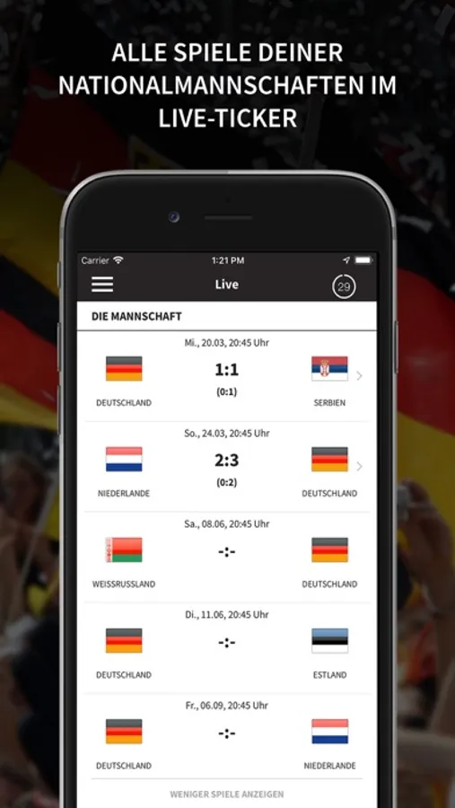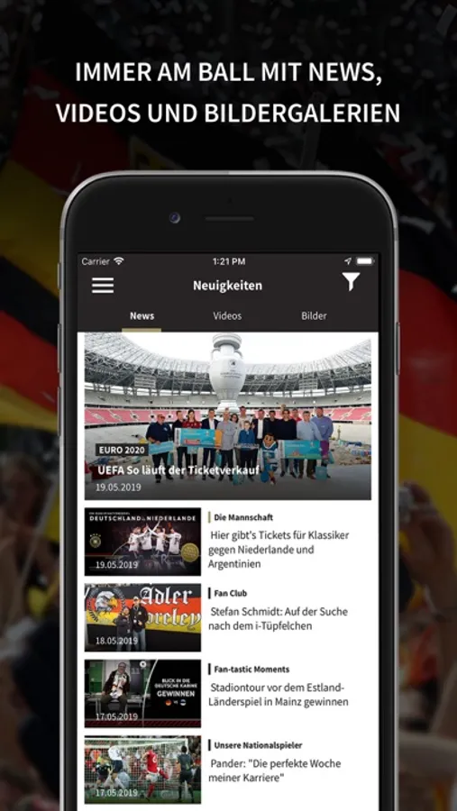 Natürlich kann der User die Fan Club-App auf seine persönlichen Bedürfnisse einstellen. Im News-Bereich ermöglicht ein Filter beispielsweise die Meldungen zu sortieren – wer nur die reinen Fan Club-Nachrichten lesen will, kann dies ebenso einstellen, wie derjenige, der alle Infos vom A-Team, den Frauen oder der U 21 haben will. Auf jeder Ebene gibt es weitere Möglichkeiten für immer detailliertere Informationen. Klickt Euch zum Beispiel durch die Spiele der EM, WM, der Olympischen Spiele oder des Confed Cups.