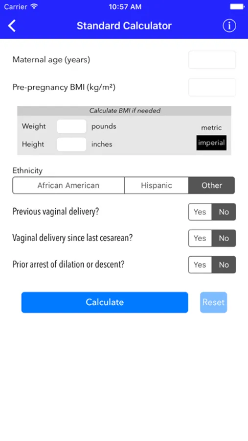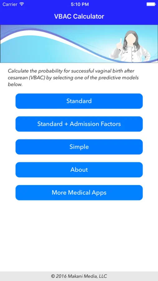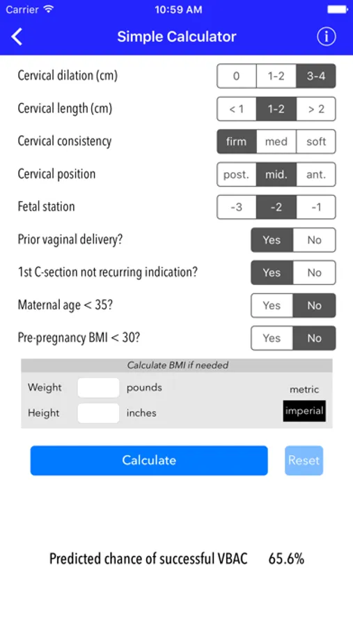 The VBAC Calculator is a convenient tool for predicting the success rate of a vaginal birth after cesarean (VBAC). The app consists of 3 calculators which use patient-specific data in order to generate a predictive score.