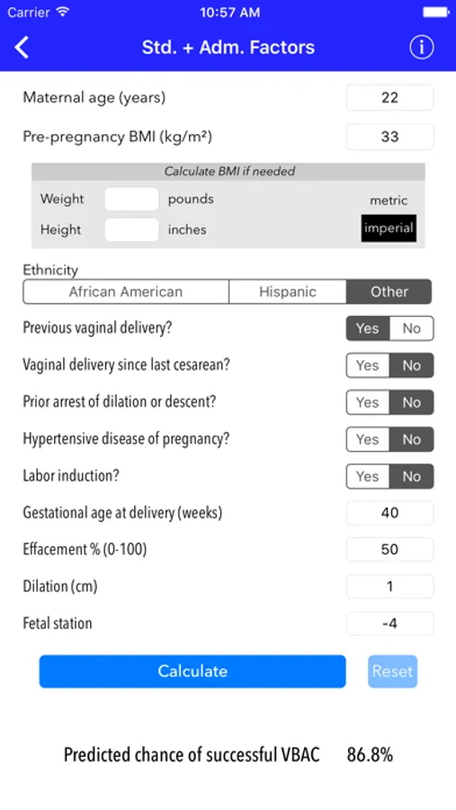 The "Standard" calculator uses the widely-used predictive model published in Grobman, William A., et al., “Development of a nomogram for prediction of vaginal birth after cesarean delivery,” Obstetrics & Gynecology, volume 109(4), pp. 806-812, 2007. This predictive model uses pre-pregnancy BMI and prior medical history to predict VBAC success rates. It can be used at any time during the term of pregnancy during a clinical visit.