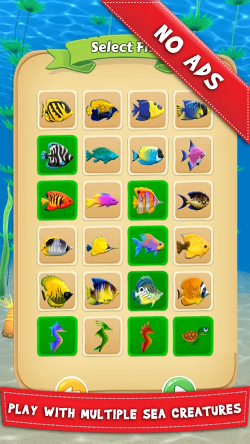 • Different fish to choose from, all with varying contrasting colors, you can also choose multiple fish types to play with at the same time. Now including seahorses and turtles!