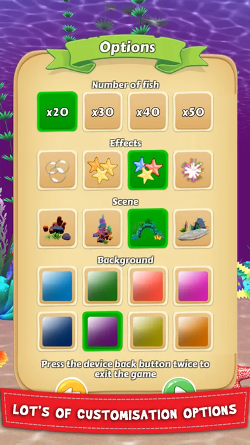 • Choose from multiple effects that are created where ever the game screen is touched (bubbles, starfish, fireworks)