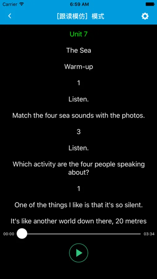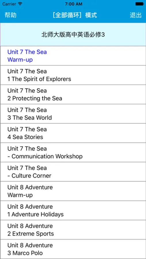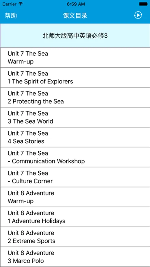 本应用对应外北师大版高中英语必修3课本,具有跟读模仿,自动听写,变速播放的复读机功能。