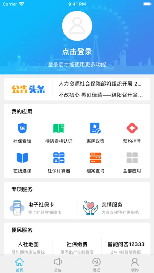 绵阳智慧人社客户端方便广大市民对社保信息的查询、即时了解社保政策、简化某些社保的办事流程,即时了解自己的社保的变化情况。具有个人相关保险险种查询、社保公共信息查询、新用户参保申请、定点医院及定点药店查询等功能