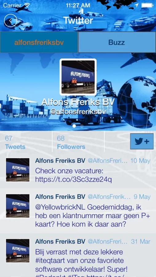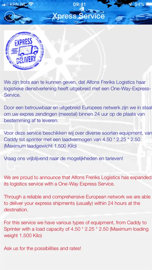 It is an information app. Info about our company Alfons Freriks Logistics. With news from the transport branche via RSS feed, with pics, email adresses and phonenumbers of our employees. a link to our Twitter account, Facebookaccount, a description of the services we offer. The location of both of our offices with addresses. Our 3 monthly News Flashes as pics. Links to the sector transport. The possibillity to send an e-mail.