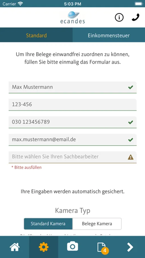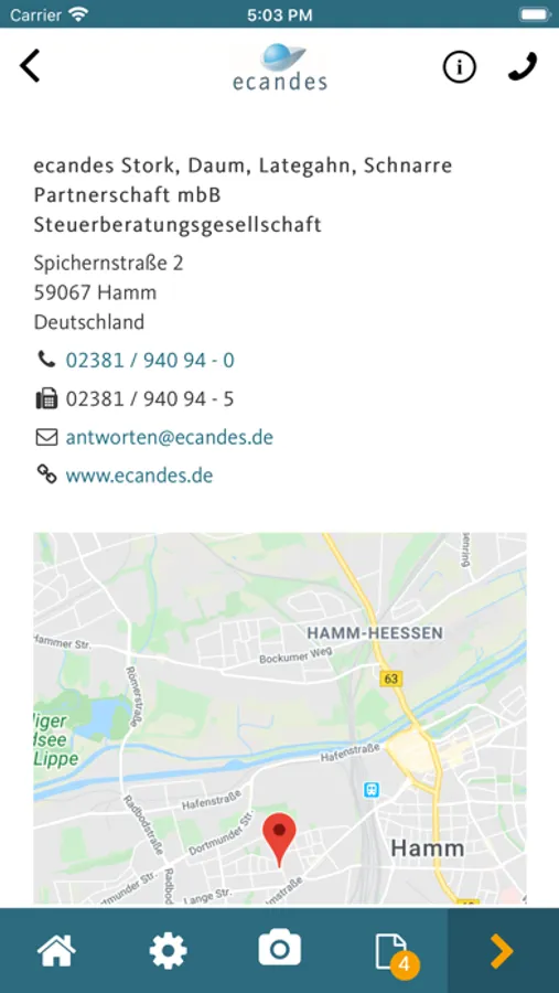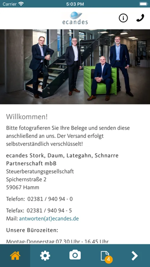 Mithilfe dieser Smartphone-App können Belege, Dokumente und andere Schriftstücke schnell, sicher und komfortabel an die ecandes Stork, Daum, Lategahn Partnerschaft Steuerberatungsgesellschaft gesendet werden.