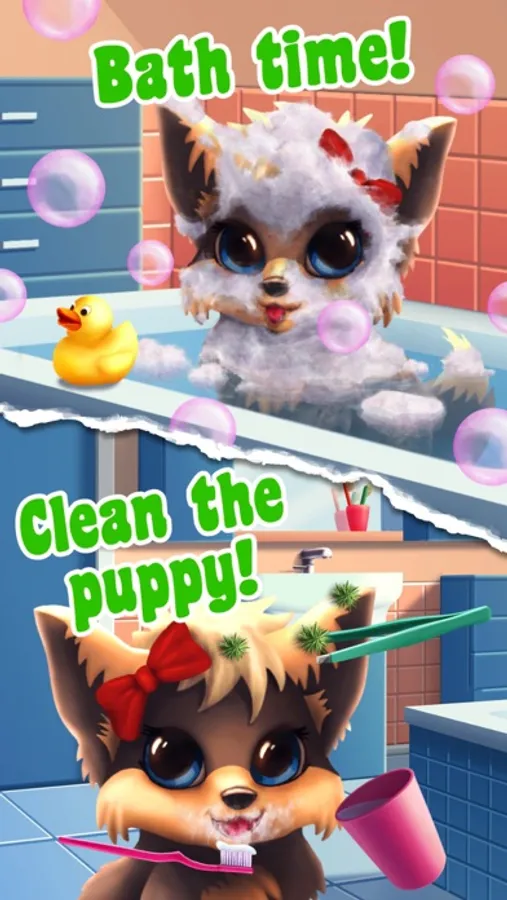 • Oh no, look at Bella, she really needs to take a bath. Clean her up with a bubbly sponge, rinse and dry her fur and take care of her teeth!