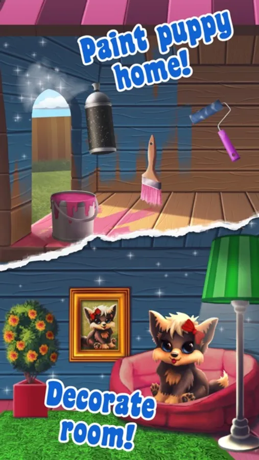 • When the doghouse is ready, it’s time to decorate it! Paint the floor in a cute pink color and the walls in a crystal blue. Make it shiny by spraying sparkling stars everywhere in the room. Create your dream interior by decorating room with your favorite furniture!