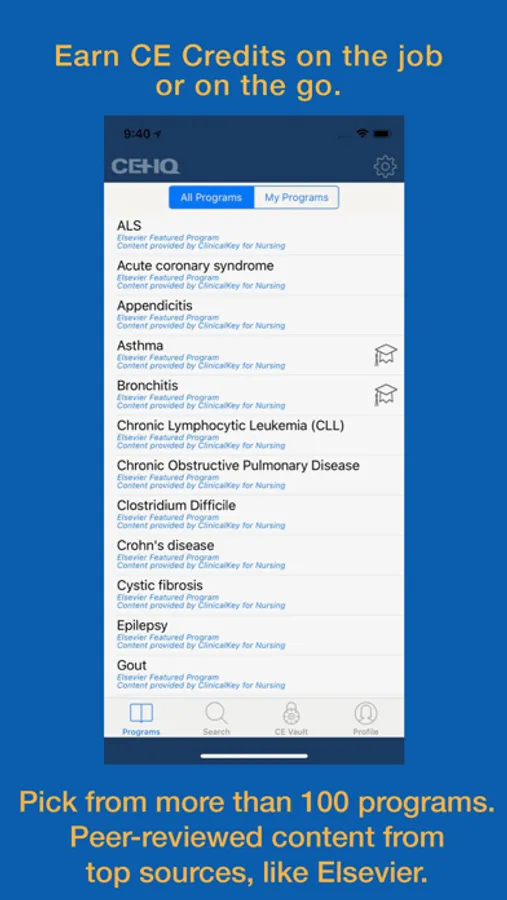 CEHQ (Continuing Education HeadQuarters) is the first mobile app that lets you earn nursing Continuing Education Credits in minutes even when you're on the job or on the go. You earn high-quality, affordable Continuing Education Credits by completing quick learning activities while treating patients, during a commute, in your spare time, or over a lunch break. You gain access to health-related research, programs, and certificates of completion — all with the goal of helping you earn Continuing Education Credits anytime, anywhere.