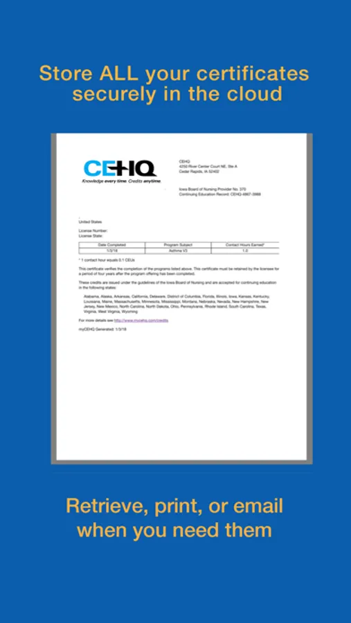 CE Vault. Save Certificates of Credit so you can email, print, or export them whenever you like. Upload Certificates of Credit you've earned from other sources into the secure CE Vault so you have all your Credits at your fingertips. Use the Vault for FREE with your completed profile.