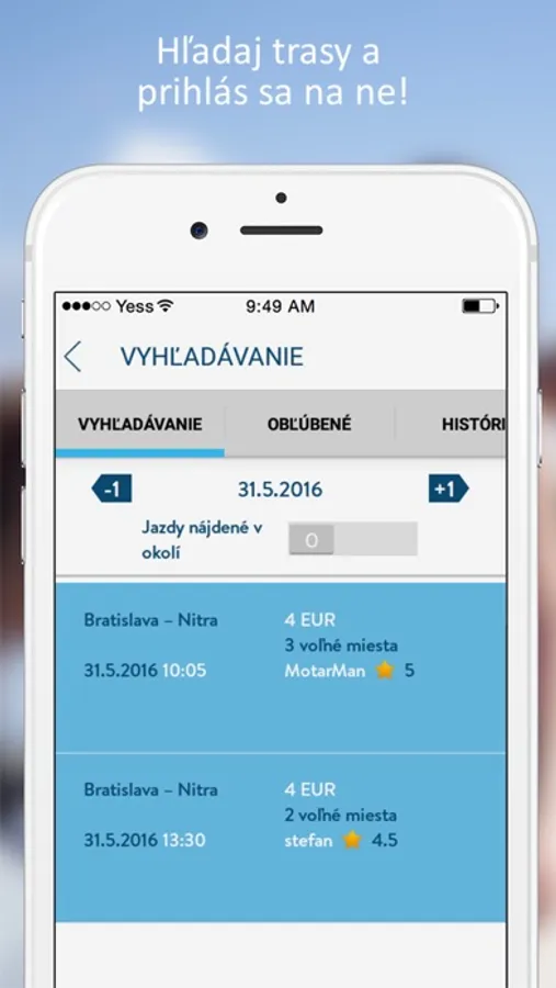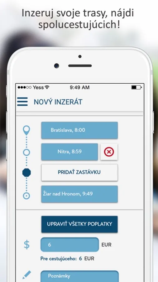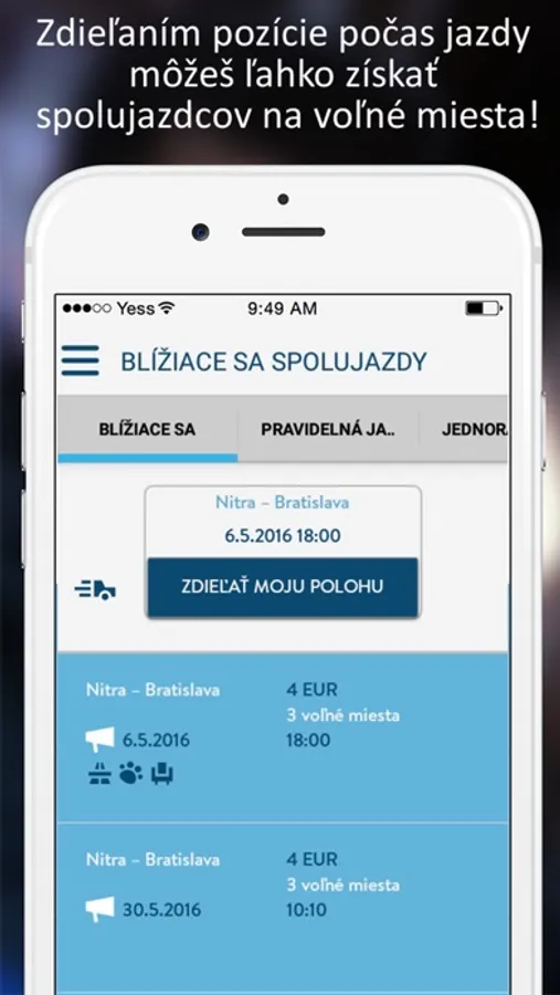 Ak cestuješ autom, a máš minimálne jedno voľné miesto, po rýchlej registrácii podaj svoj inzerát a okamžite môžeš očakávať spätnú väzbu od cestujúcich. Pomocou aplikácie fungujúcej v reálnom čase stačí podať inzerát aj tesne pred odjazdom; na základe tvojich GPS-súradníc ťa cestujúci nájdu aj po zahájení jazdy!