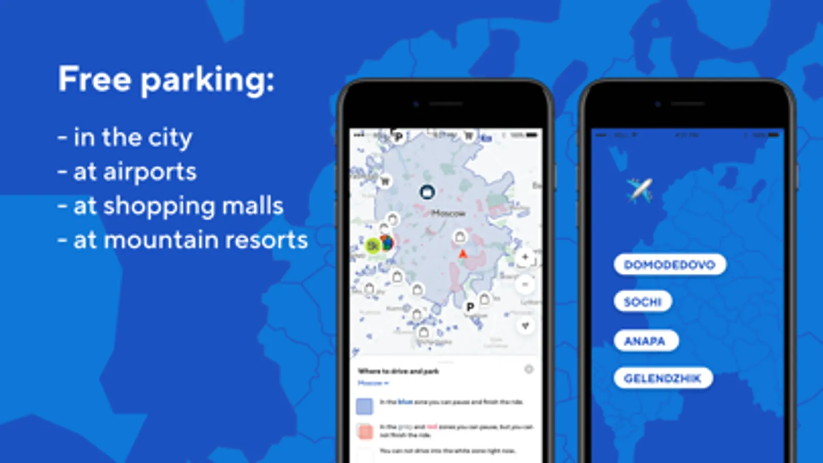 Park free of charge in Moscow parking lots and in the special parking zones at Domodedovo, Zhukovsky, Sochi airports, as well as at Anapa and Gelendzhik air terminals.