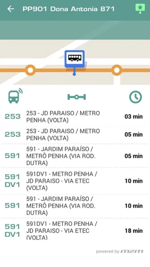 · Selecione o ponto de parada desejado e visualize as linhas que passam por este ponto e suas respectivas previsões de chegada;