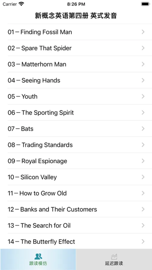 本应用对应新概念英语第四册课本,具有跟读模仿,自动听写的复读机功能。