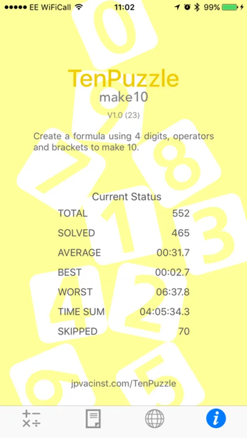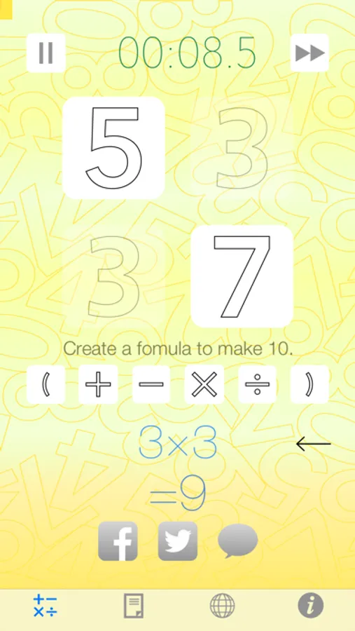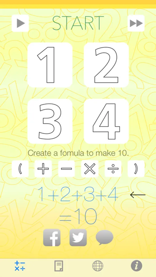 Tap 4 numbers and operators to write a fomula and get the result as 10.