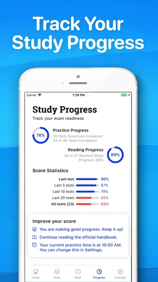 - Track Past Test Results - Individual tests will be listed with pass or fail and your mark