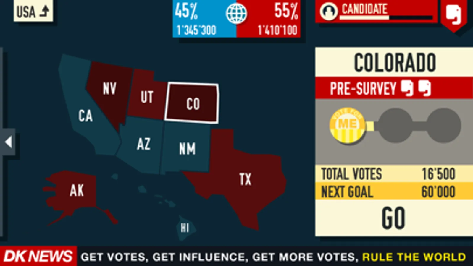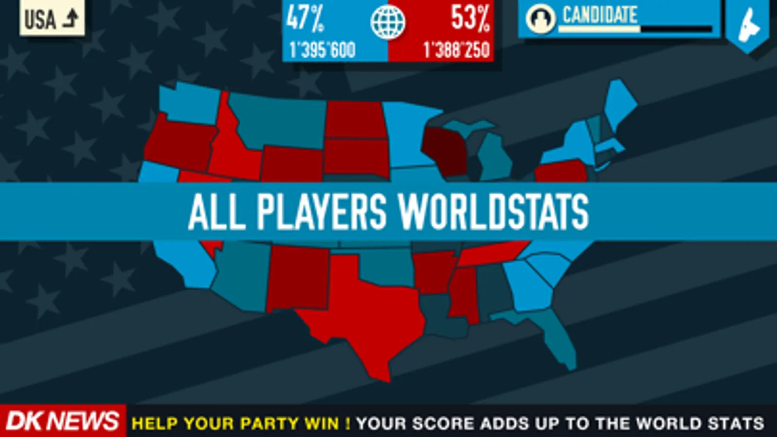 Choose your party, travel around the States and pop up in all electoral offices to gather more and more votes.