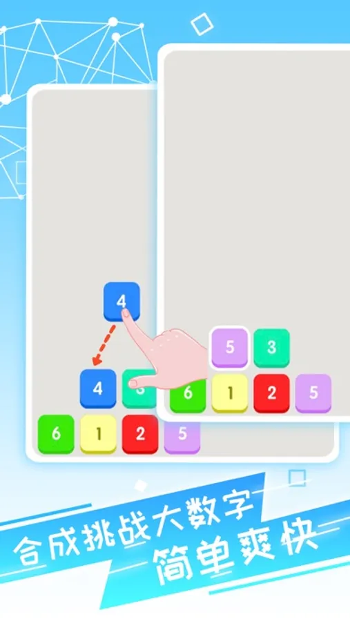 1.移動數位,每兩顆相同的數位在一起時可以合併成一個更大的數位。