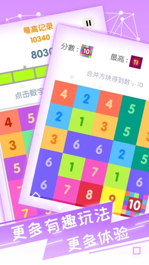 2.有時間限制,當時間用完或沒有可合併的數位時,出現一排新的數位。