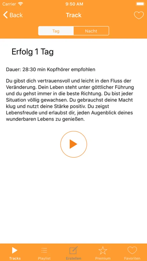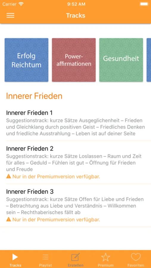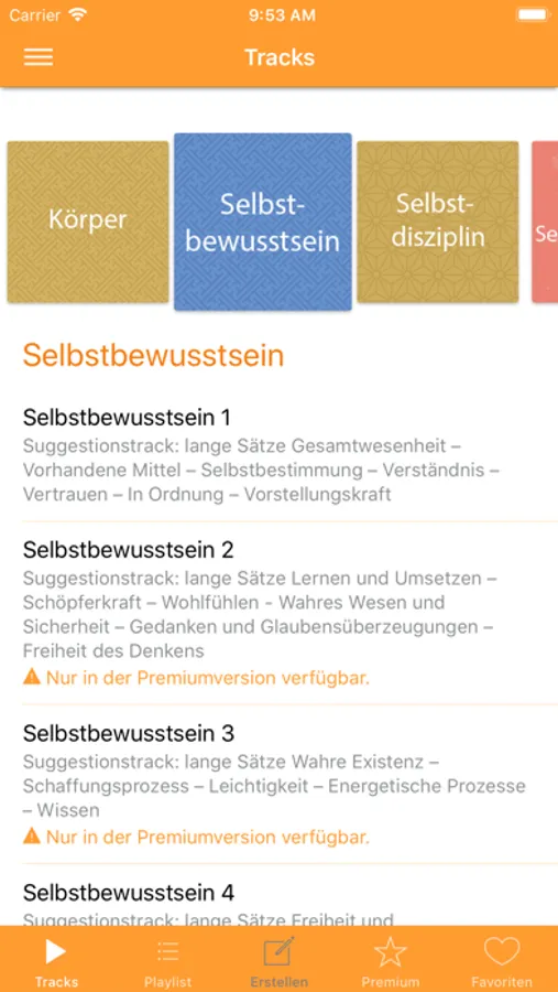 57 Tracks aus 16 Kategorien führen dich durch die verschiedenen Schichten deines Bewusstseins. Die meisten Tracks gibt es als Tag- und Nachtversion (ohne Aufwachphase). Bewährte wirkungsvolle Suggestionen helfen dir direkt und indirekt dabei, dich neu auszurichten, dich neu zu erschaffen und dein Leben positiv zu verändern. Alle Tracks sind mit isochronen Tönen (siehe FAQ in der App) unterlegt, wodurch nahezu jeder automatisch in den gewollten Trancezustand gelangen kann.