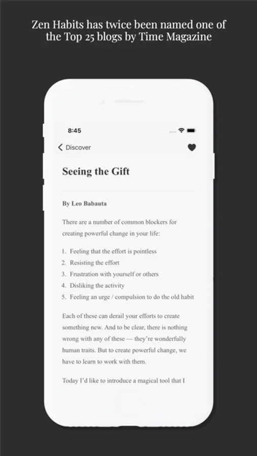 "I had never heard of Zen Habits before, but as soon as I started reading through the brief but powerful entries, I stopped looking for additional self help apps."