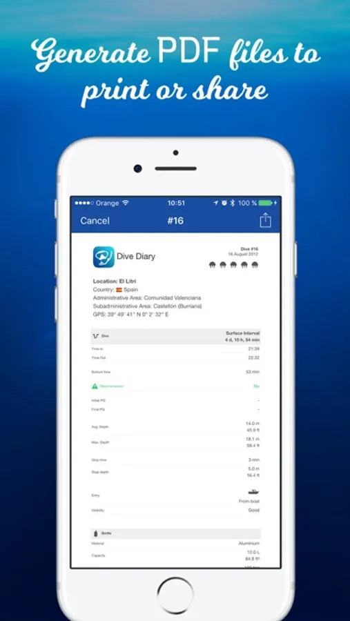 Generate beautiful PDF files for your dives to print or share it if you want.