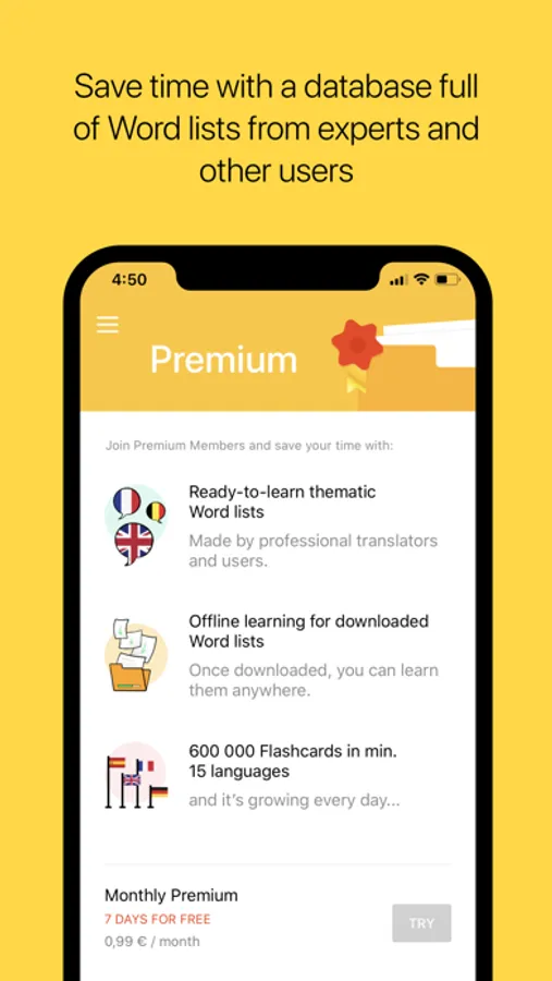 - Save time by downloading users' and experts' vocabulary as the Premium member from the database with many languages and topics for every purpose: travel packages, relocation, shopping, illness… more than 600 000 Flashcards.