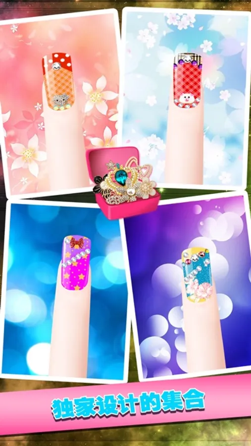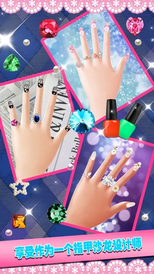 In this free nail app you can choose from a lot of gorgeous nail polish and great collection of different sparkling stickers, patterns and more nail design extra’s to decorate your nails with.