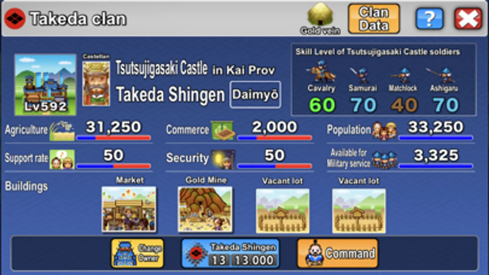 From the castles that players control, there is agricultural income and commercial income. The income depends on the population, the loyalty of the people, and public safety.