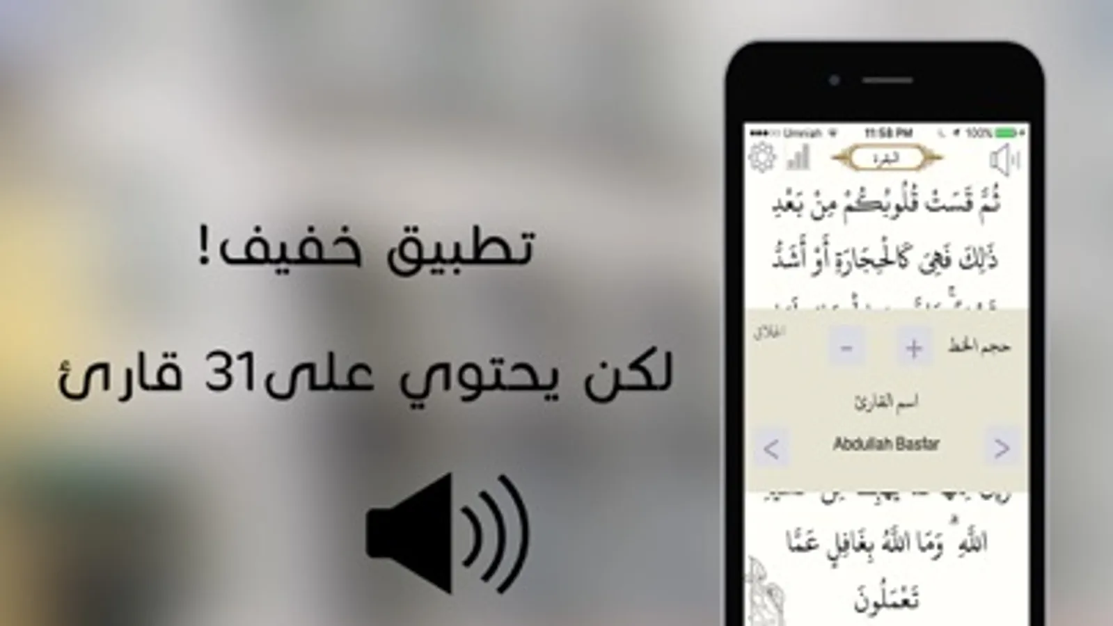 يمكنك الاستماع الى الايات بشكل صوتي عبر اختيار قارئ من بين ٣١ قارئ في التطبيق