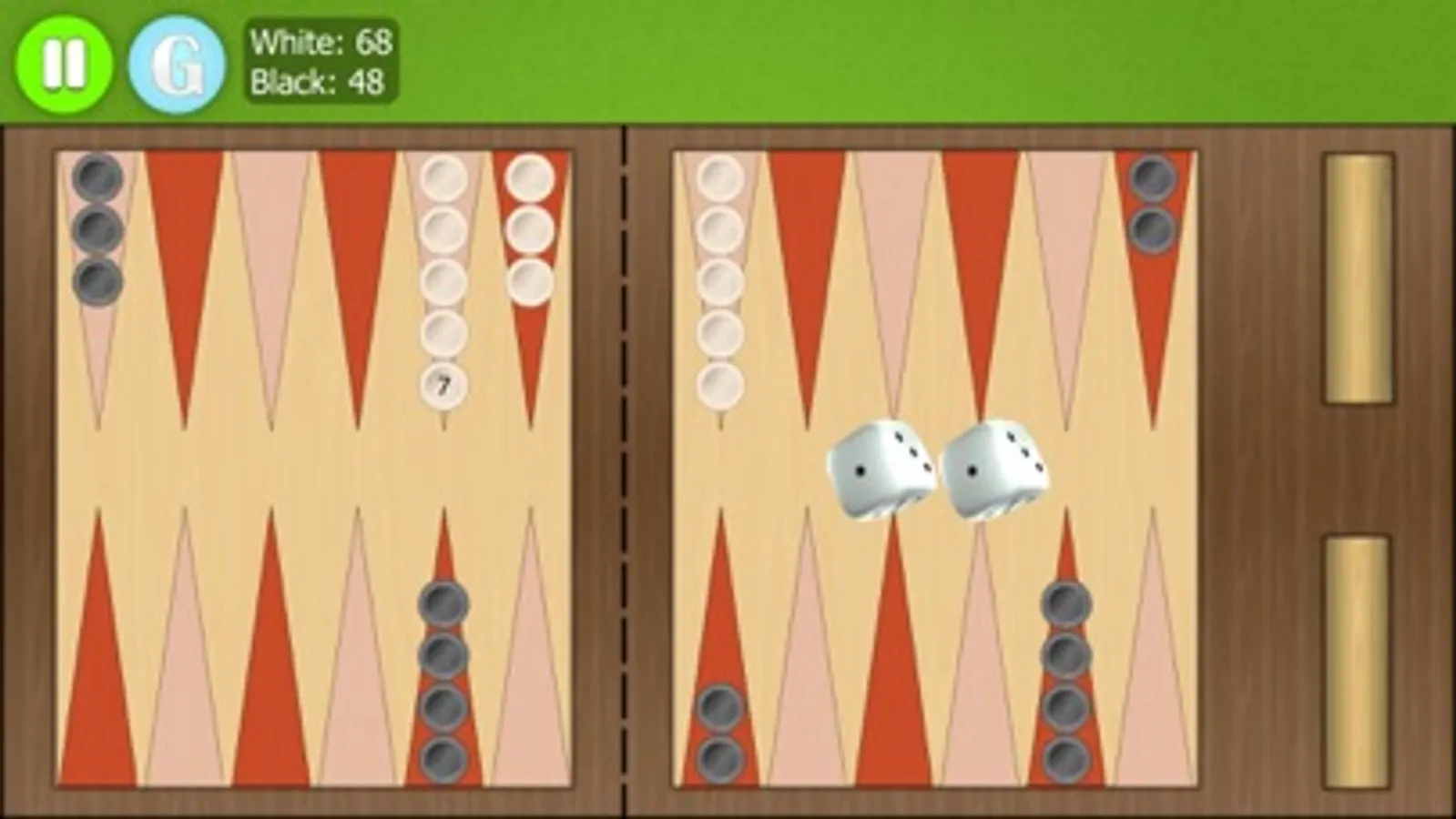 In this backgammon game, you move pieces around the board based on dice rolls and try to remove all your pieces to win. Includes challenging AI, customization options, and detailed statistics.