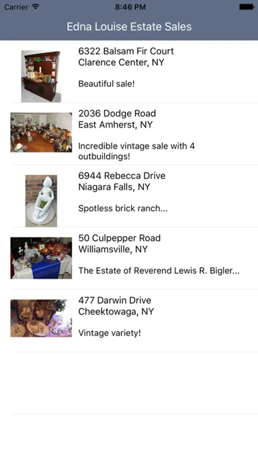 Edna Louise Estate and Household Liquidations is a company specializing in the organization, appraisal and sale of everything found in any estate. As the premier estate sale practitioner in Western New York, we offer client collections including traditional antique, Mid Century Modern and contemporary furnishings, art and art objects, china and glass, ephemera, vintage finds of every kind, collectibles, clothing from everyday to Haute Couture, musical instruments, vintage and modern electronics, power and farm equipment, mechanic, woodworking, general, power and shop tools, appliances, practical items, sporting and fitness, yard and garden, power sports, automobiles, and much more. The Edna Louise app offers a quick overview of our current week’s sale lineup with convenient access to descriptions, photos, map directions, calendar access, sharing with your Facebook account and notifications from on-site beacons which inform our buyers of featured contents when they enter each sale. Be sure to visit www.ednalouise.com for more information on our company and to sign up for email notifications. We can be reached by telephone at (716) 812-1018, and we are also on Facebook @ednalouiseliquidations as well as Twitter @EdnaLouiseEHL and Instagram @edna_louise.